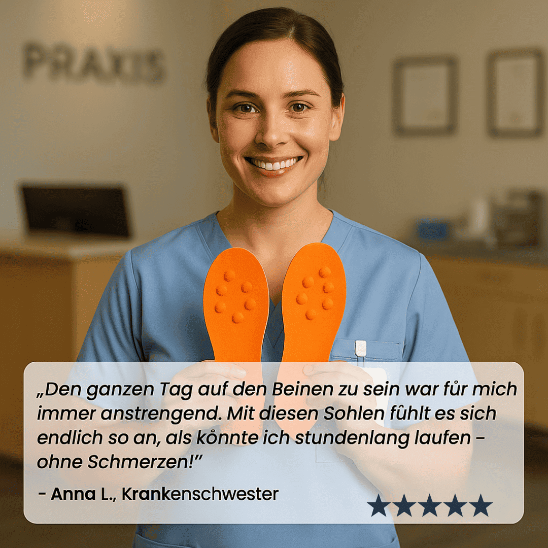 Ich stehe täglich 10 Stunden in der Pflege – abends hatte ich sonst immer brennende Füße. Mit den Sohlen ist das komplett anders: kein Druck, kein Ziehen. Ich komme endlich schmerzfrei nach Hause.